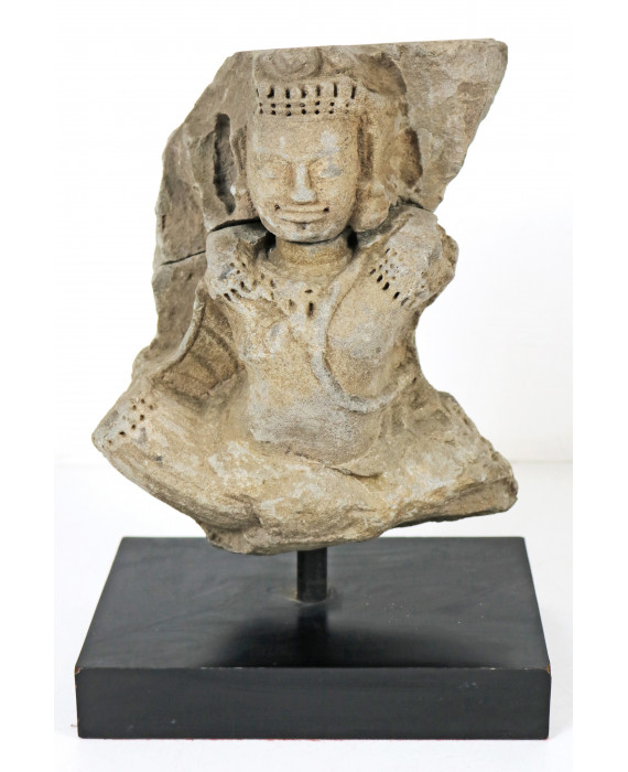 Frammento in arenaria scolpita raffigurante Apsara danzante e sorridente, su piedistallo. Thailandia, sec. XX. Alt. cm26