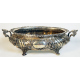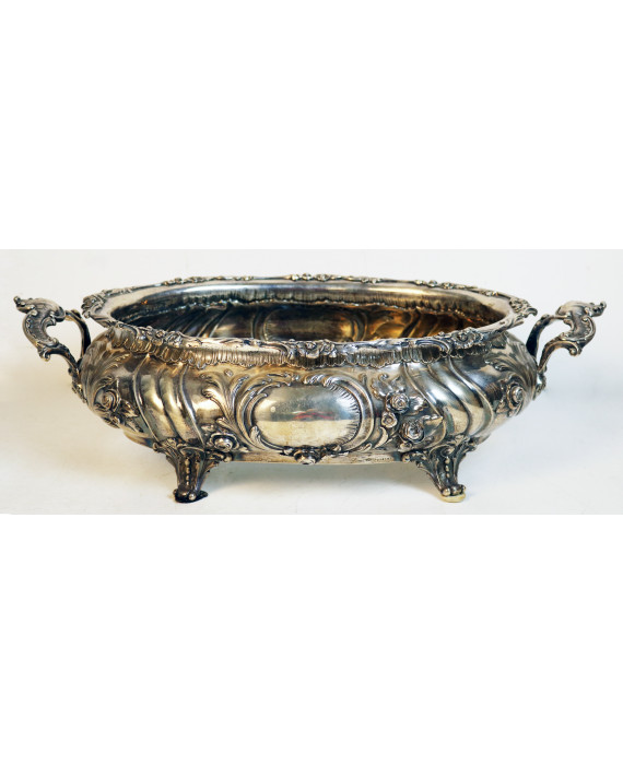 Centrotavola in argento 800 lavorato con serti vegetali e fiori, quattro peducci a voluta, piano interno in vetro (scollato). Peso dell'argento gr. 1580