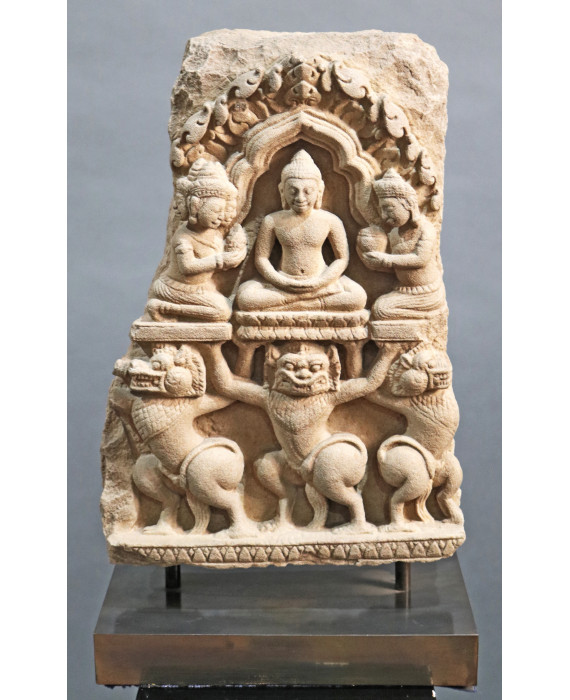 Frammento in arenaria scolpita a bassorilievo con Buddha seduto sui leoni, su supporto. Thailandia, sec. XX. cm36x25x8