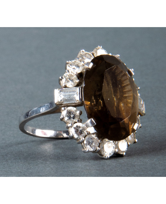 Elegante anello in oro bianco 18 Kt con 14 diamanti taglio brillante e due taglio baguette ed un quarzo fumè a taglio ovale di dimensione mm 18x13. Peso gr. 9,2, misura 15 . Allegata dichiarazione di autenticità del perito ed esperto, specializzazione preziosi, Federico Perinelli
