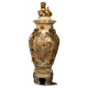 Grande vaso in porcellana interamente dipinto con samurai e personaggi, decorato in oro con quattro draghi alati ad altorilievo, bordo polilobato con coperchio a cane di Pho, piedistallo circolare. Giappone, periodo Satzuma, inizi sec. XX. Alt. cm135 (filatura sul bordo e alcune mancanze)