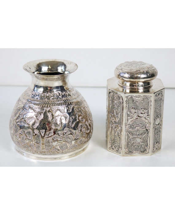 Lotto di due oggetti in argento: una scatola con coperchio sbalzata con putti alati, festoni, volute e trionfi di musica, bolli Parigi sec. XIX ed un vaso inciso con animali ed alberi di manifattura orientale. Peso tot. gr. 600