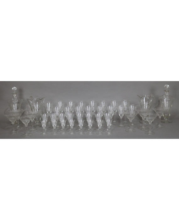 Elegante servizio di bicchieri in cristallo inciso a volute vegetali, composto da otto bicchieri da acqua, otto da vino, otto coppe da champagne, otto da liquore, otto da rosolio, due caraffe e due bottiglie con tappi (lievi scheggiature)