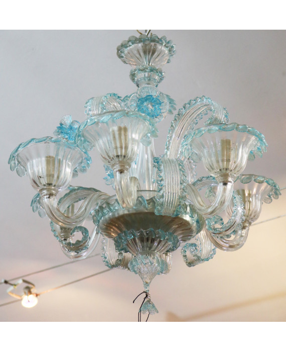Lampadario a sei luci in vetro trasparente e blu di Murano (mancante di un elemento e lievi difetti)