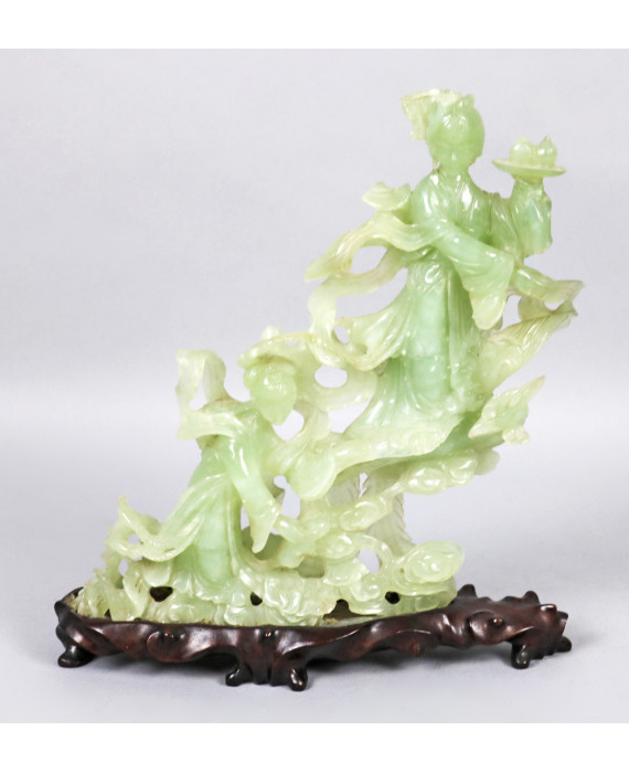 Scultura in giada verde raffigurante guanin con fenice e nembi, su base in legno. Alt. cm25 (mancanze)