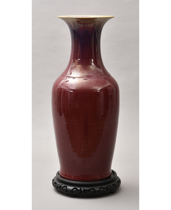 Vaso in porcellana sangue di bue su base in legno ebanizzato. Cina, sec. XIX. Alt. cm57 (filatura passante all'intero corpo del vaso)