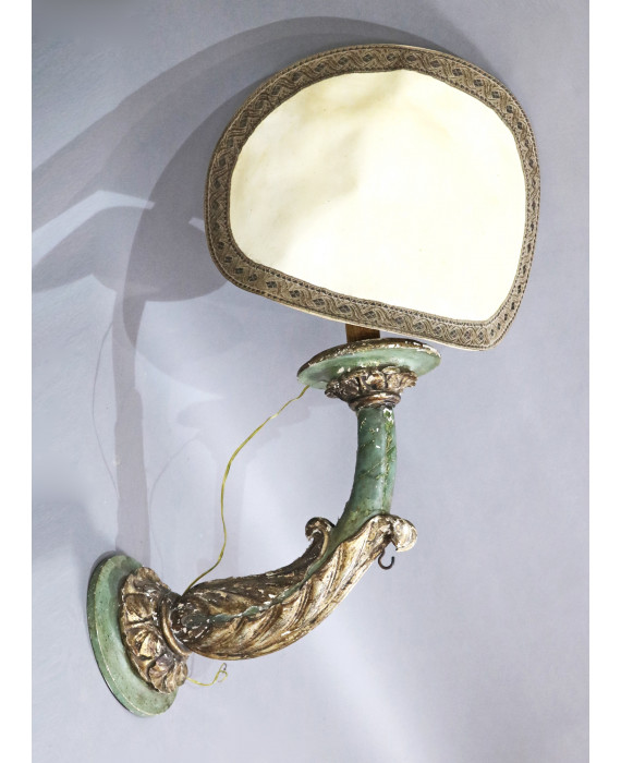 Braccio portacero in legno dorato e laccato verde con intaglio vegetale, elettrificato. Lungh. cm51 (difetti e mancanze alla laccatura)