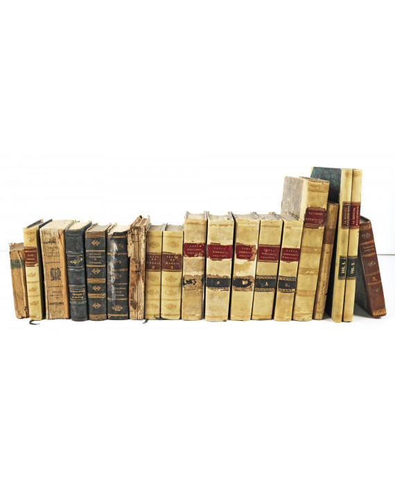 Lotto di 18 volumi di argomento medico: G. Carpentier-Mericourt. Trattato sui mali delle mammelle. Firenze, 1845; F. Domenico Auda. Pratica de' spetiali. Venezia, 1683; Antonio Campana. Farmacupea Ferrarese. Pesaro, 1826; G. B. F. Descuret. La medicina delle passioni. Napoli, 1860; Filippo Carlo Hartmann. Istituzioni di patologia generale. Bologna, 1830; G. Tommasini. Della infiammazione e della febbre continua. Bologna, 1832; Girolamo Fracastoro. Della sifilide. Bologna, 1765 (rotture al dorso); G. P. Maygrier. Nuove dimostrazioni di ostetricia, con incisioni in rame. Prima versione italiana con annodazioni ed aggiunte del chirurgo Marco Foscarini. Pisa, 1831; Gioivanni Battista Capello. Lessico farmaceutico- chimico. Decima impressione riveduta e accresciuta da Lorenzo Capello. Venezia, 1775; Giovanni Pietro Frank. De curandis hominum morbis. Milano, 1831. Opera in due volumi; Vincenzo Lanza. Nosologia positiva. Napoli, 1841-49. Opera in cinque volumi; Giacomo Tommasini. Lezioni critiche di fisiologia e patologia. Napoli, 1804. Volume terzo (opera incompleta); La medicina e la chirurgia, rivista settimanale. Da anno I n. 1 (15 febbraio 1880) a anno II n. 35 (31 marzo 1881). Raccolta in due volumi.