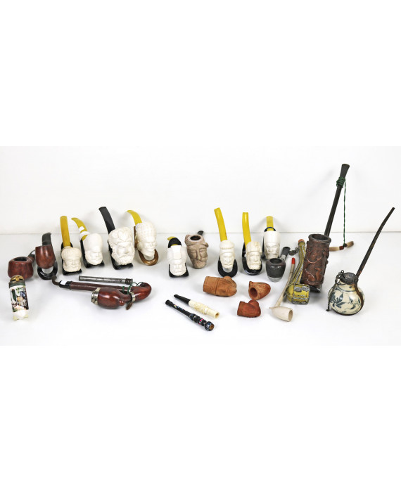 Lotto di 22 pipe in diversi materiali, tra cui alcune in schiuma, legno intagliato e porcellana (difetti)