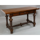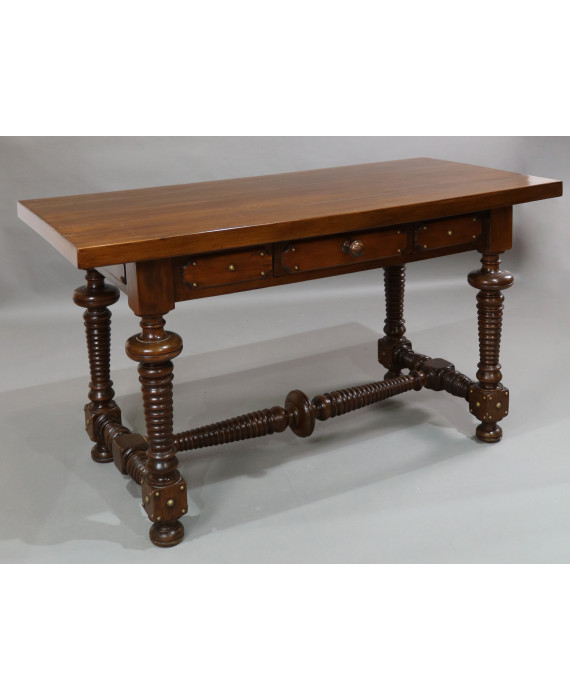 Tavolo ad un cassetto in legno di noce, quattro sostegni e traverse tornite, borchiature in ottone. Spagna, sec. XX. cm82x150x70