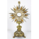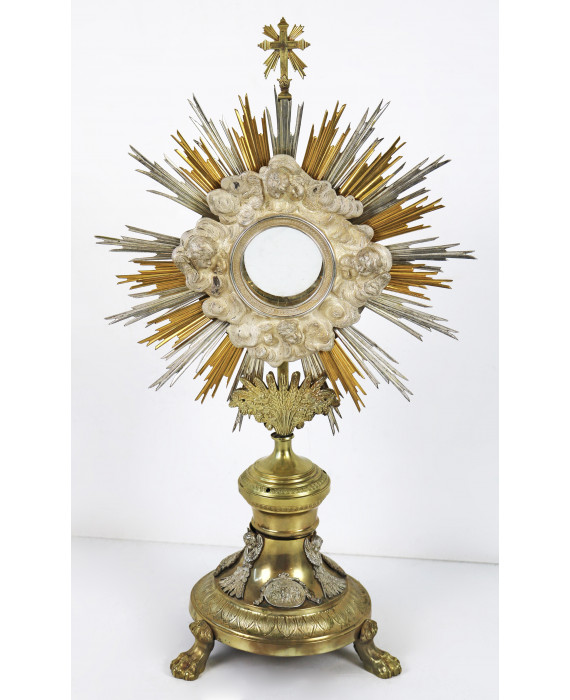 Ostensorio in metallo dorato, argentato e lavorato con amorini e nembi, spighe di grano e tralci d'uva e fasce decorate a palmette e girali, tre peducci a zampa. Italia, sec. XIX. Alt. cm55 (fori)