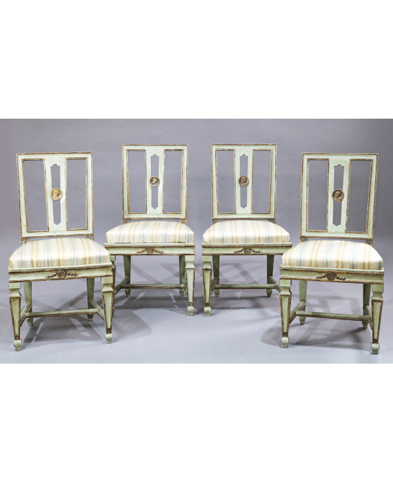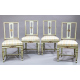 Gruppo di quattro sedie in legno laccato con parti dorate, seduta rivestita in stoffa, gambe piramidali. (lievi usure)