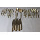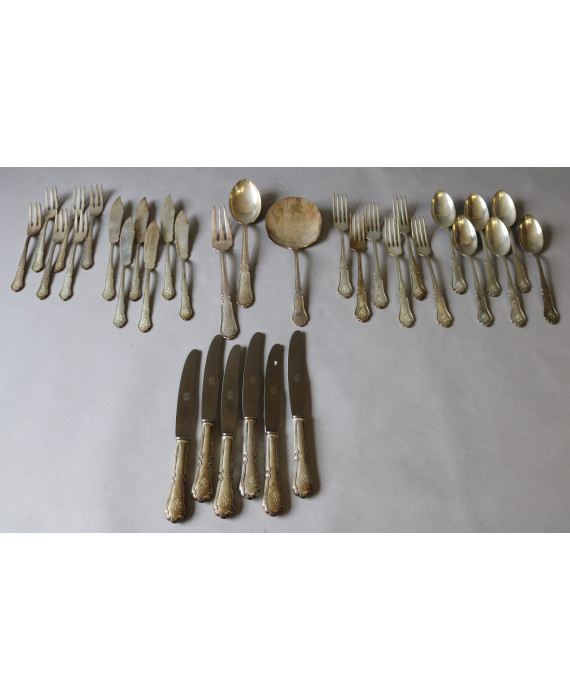 Servizio di posate in argento 915, bolli Spagna, composto da sei forchette, sei cucchiai e sei coltelli, sei forchette e sei coltelli da pesce, tre posate di servizio. Peso tot., esclusi coltelli con lama in acciaio, gr. 2000