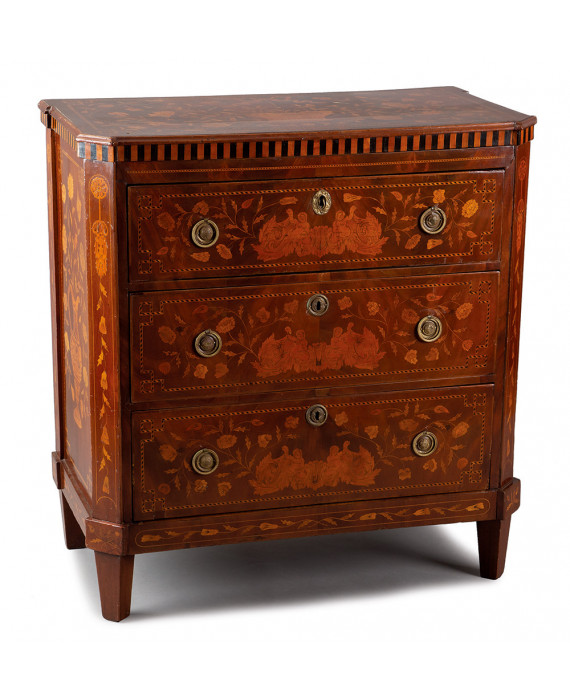 Particolare comò impiallacciato in legno di mogano ed interamente intarsiato con fiori, vasi di frutta e figure sdraiate tra volute, piano apribile con etagere a due ripiani a scomparsa, tre cassetti inferiori. Olanda, sec. XIX. cm95x90x49