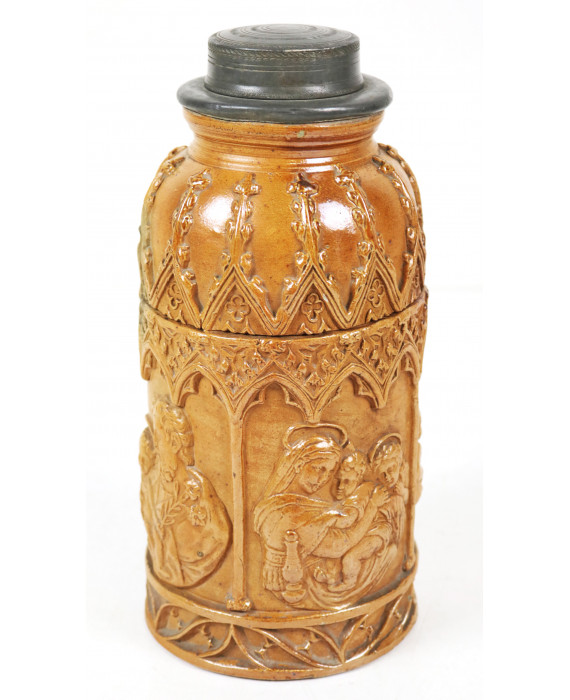 Particolare termos in terracotta lavorata con serti vegetali e scene sacre, con tappo in peltro. Italia, inizi sec. XX. Alt. cm27 (scheggiature e restauri)