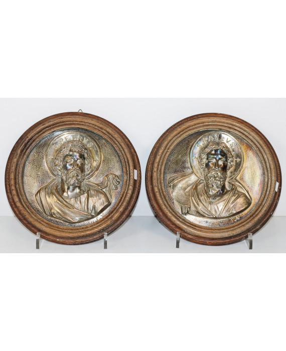 Coppia di tondi in metallo dorato e lavorato a bassorilievo raffiguranti volti di San Pietro e Paolo, con cornici. Diam. cm17