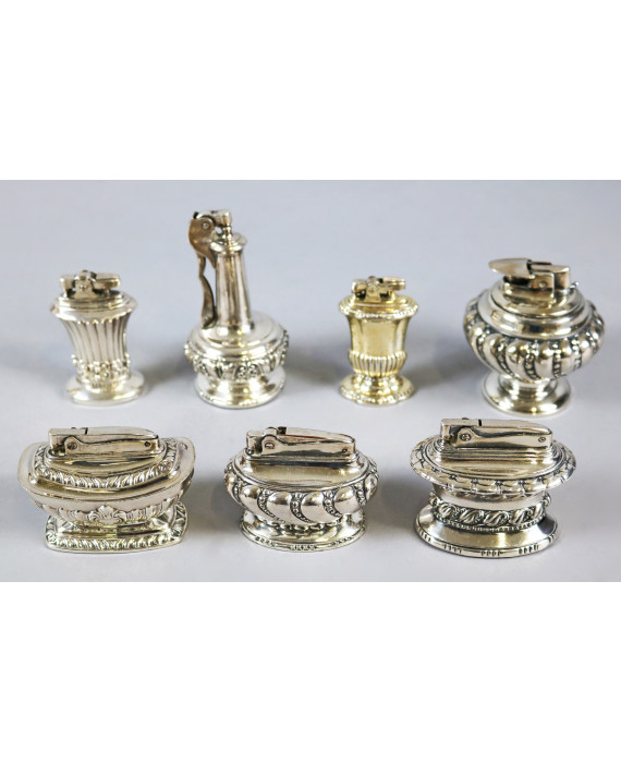 Lotto di sette accendini da tavolo in metallo argentato di marca Ronson.