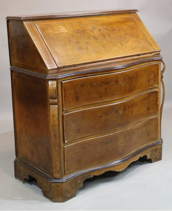 Ribalta impiallacciata in legno di noce ed intarsiata con vasi fioriti e pappagalli, calatoia con all'interno tre cassettini e vani a giorno, tre cassetti inferiori, fronte mosso. cm110x104x50