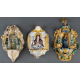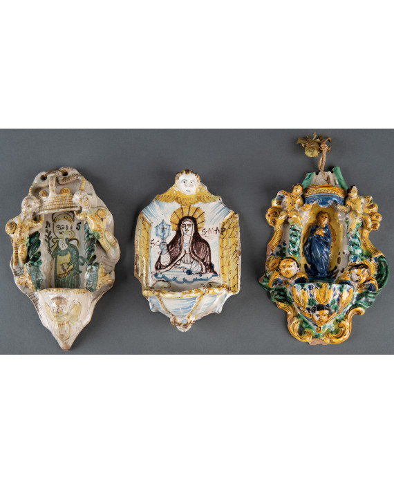 Lotto di tre acquasantiere in terracotta smaltata, dipinta e lavorata con Madonna, Santi, putti alati e cherubini. Italia, meridionale, sec. XVII/XVIII. Alt. cm26/26/24 (mancanze e difetti)