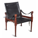 Poltrona modello Safari, designer Hayat, in legno di mogano, con seduta, spalliera e braccioli in pelle nera. Anni '70 (usure del tempo)
