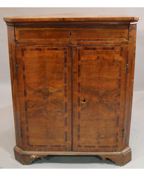 Angoliera lastronata in legno di noce e filettata in legni chiari, un cassetto, due sportelli. Italia, sec. XIX, periodo Carlo X. cm108x61x61 (difetti e mancanze alla lastronatura)