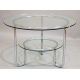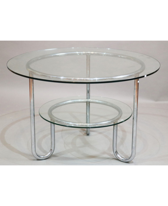Tavolo da salotto di design con piano e ripiano inferiore tondi in vetro e base in tubolare di metallo curvato. Alt. cm57; diam. cm90 (usure del tempo)