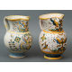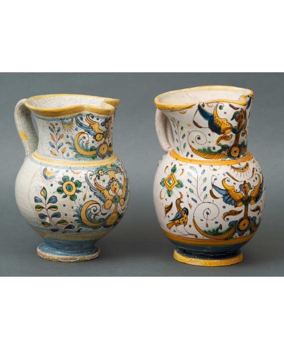 Lotto di due boccali trilobati in maiolica dipinta con decoro raffaellesco. Manifattura di Acquapendente-Bagnoregio, metà del sec. XVII. Alt. cm18 (restauri e reintegri)