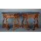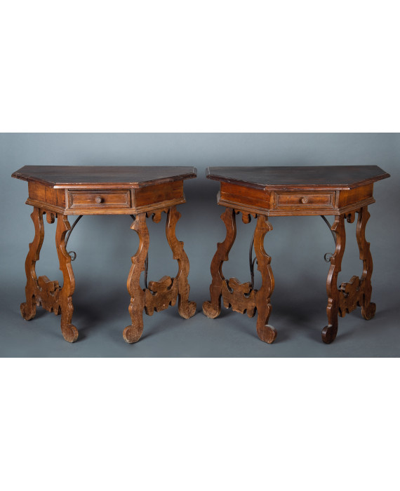 Coppia di console in legno di noce, un cassetto, due sostegni a lira raccordati da traversa in ferro. cm80x97x49