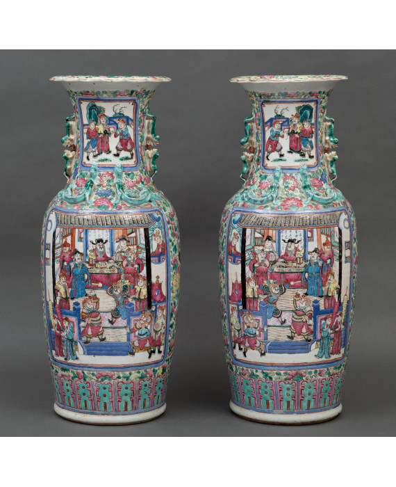 Coppia di vasi in porcellana interamente dipinta con fiori, uccelli, scene di vita e battaglie. Cina, inizi sec. XX. Alt. cm61 (fori alle basi e filatura ad uno)