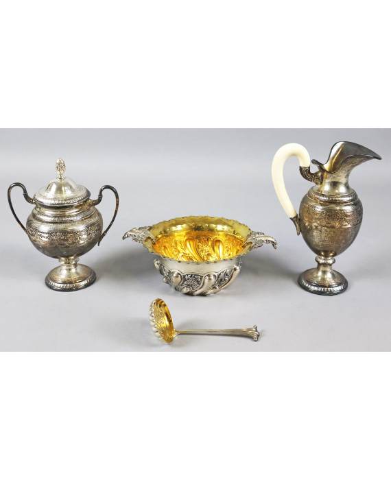 Lotto di tre oggetti in argento 925: una ciotola biansata sbalzata a volute e frutta con interno in vermeille, una zuccheriera ed un versatoio con manico in osso incisi a festoni. Peso tot. gr. 1020