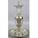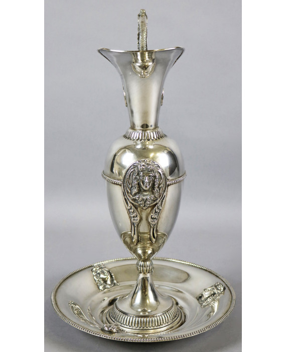 Versatoio con piatto in argento 800 lavorato con mascheroni e manico a voluta con attacco a testa di delfino. Alt. cm41; diam. cm25. Peso to. gr. 1395 (ammaccature)