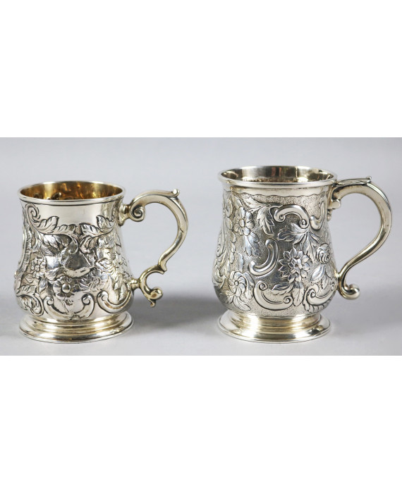 Lotto di due mug in argento lavorati con volute rocaille, fiori, serti vegetali e cartigli con iscrizioni e monogrammi. Bolli Londra, punzoni parzialmente leggibili. Peso tot. gr. 490