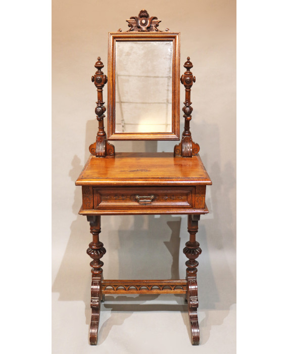 Toletta in legno tinto a noce, un cassetto, specchio basculante, sostegni intagliati raccordati da traversa. Italia, sec. XIX. cm145x52x45