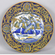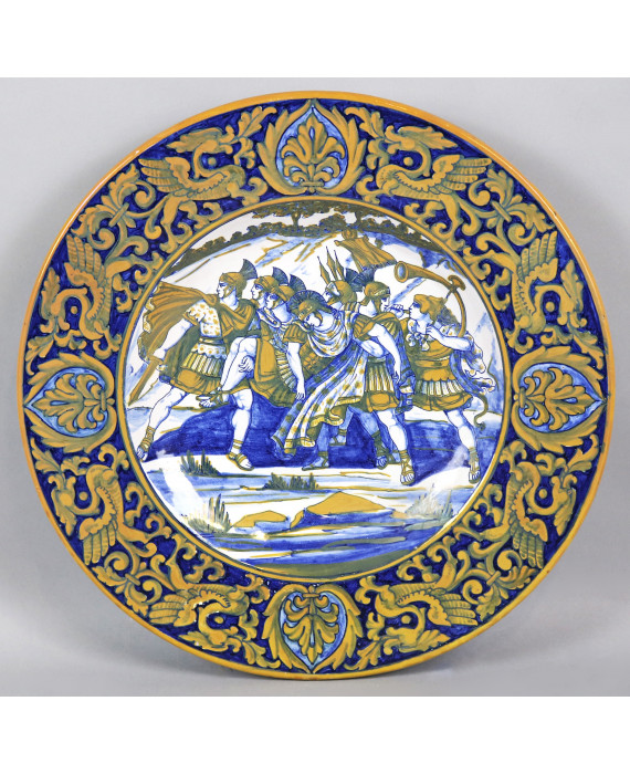 Piatto da parata in maiolica dipinta con scena classica, firmato sul retro Luca Robbia Gualdo Tadino. Diam. cm43