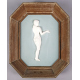 Placca in bisquit lavorata a bassorilievo con nudo femminile, monogramma in basso a destra, con cornice. cm26x20