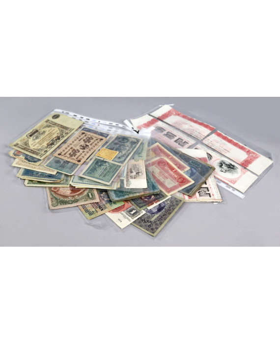 Lotto di numerosa cartamoneta circolata tra cui numerosi tagli di banconote Kronen austriache (50000, 10000, 1000, 100 ecc), marchi tedeschi, rubli e alcune azioni della società italiana Cines del 1908.