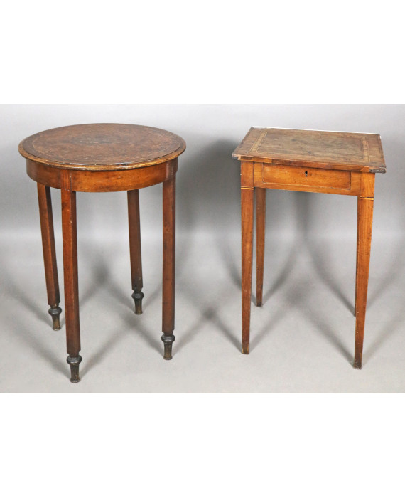 Lotto di un tavolinetto tondo ed uno rettangolare ad un cassetto, impiallacciati in legno di noce con filettature in legni chiari. Italia, sec. XIX. Alt. cm73; diam. cm54; cm70x47x41 (difetti)