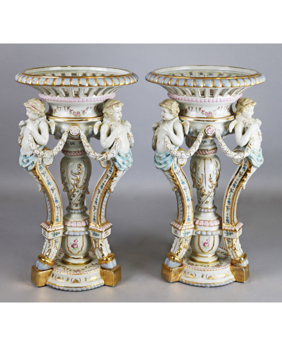 Coppia di grandi alzate in porcellana a fondo bianco dipinta e decorata in oro, conca superiore traforata sostenuta da tre putti alati raccordati da festoni. Francia, sec. XX. Alt. cm46