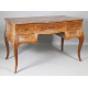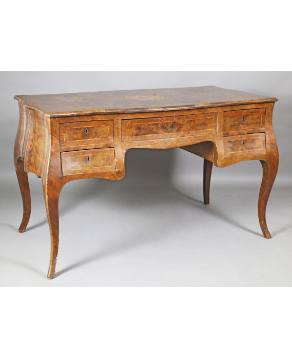 Scrivania di gusto Luigi XV impiallacciata in legno di mogano e radica di noce, filettature ed intarsi vegetali in bois de rose, cinque cassetti, gambe mosse. cm80x130x70 (lievi difetti)
