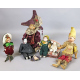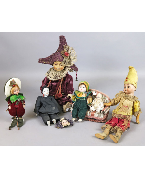 Lotto di una bambola con testa e mani in legno, marcata sul retro Faenza ed una spilla e cinque bambole con teste in biscuit (difetti)