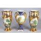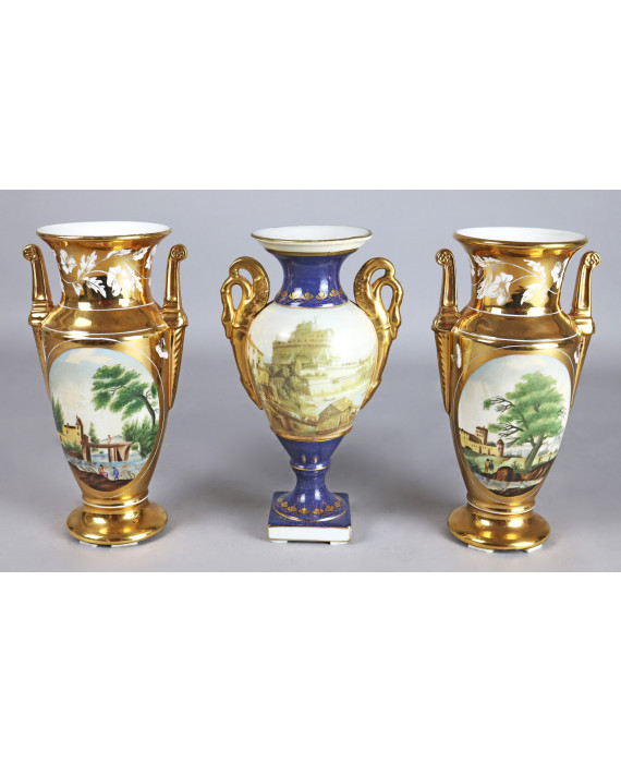 Lotto di tre vasi in porcellana: uno con anse a cigno decorato con paesaggi romani ed una coppia a fondo oro decorati con ovali raffiguranti paesaggi e scene con personaggi. Alt. cm22