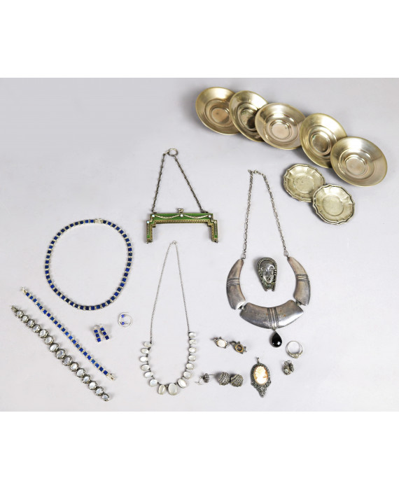 Lotto di numerosi oggetti in argento, tra cui di sette piattini, varia bigiotteria e una chiusura di borsetta da signora (lievi difetti)