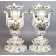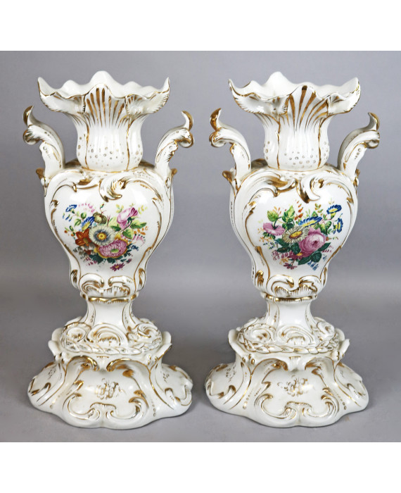 Coppia di vasi vecchia Parigi in porcellana a fondo bianco decorata in oro e in policromia con mazzi di fiori. Alt. cm40