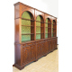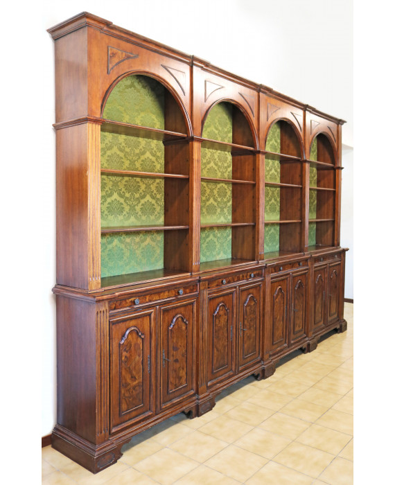 Grande libreria impiallacciata in legno di noce, parte superiore a giorno con fondo rivestito in tessuto verde, quattro cassetti, otto sportelli inferiori. cm268x403x46