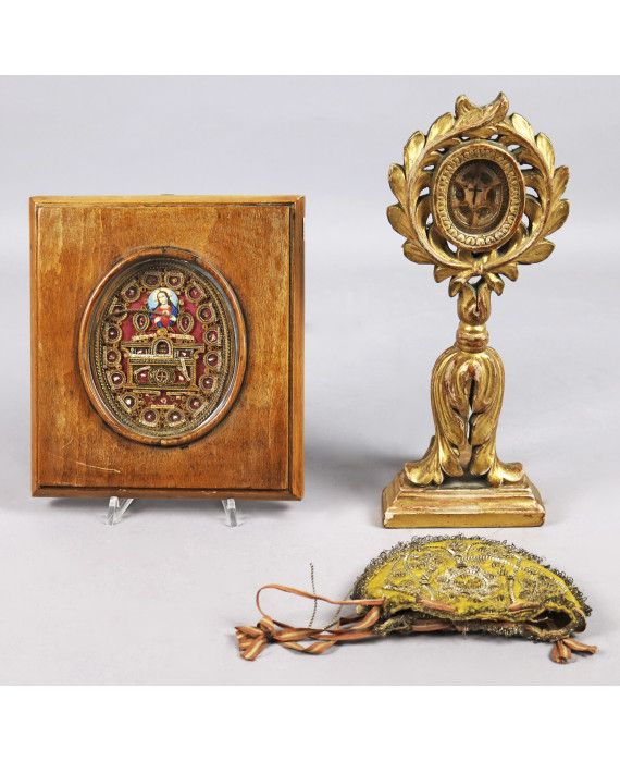 Lotto di due reliquiari: uno in legno dorato ed intagliato con serti vegetali ed uno con cornice ovale in legno. Italia, sec. XIX. Alt. cm29; cm12x10