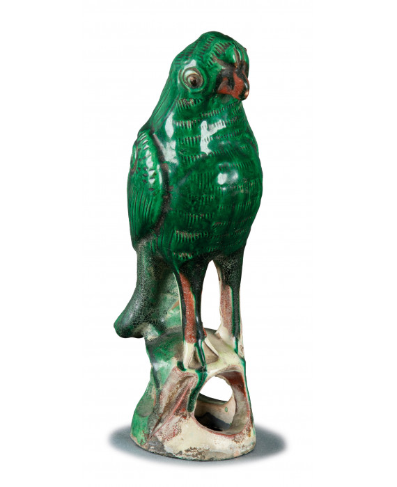 Pappagallo porta incenso in maiolica invetriata a fondo verde, sul retro etichetta Collezione Podestà Milano. Cina, sec. XIX. Alt. cm23 (lievi scheggiature)