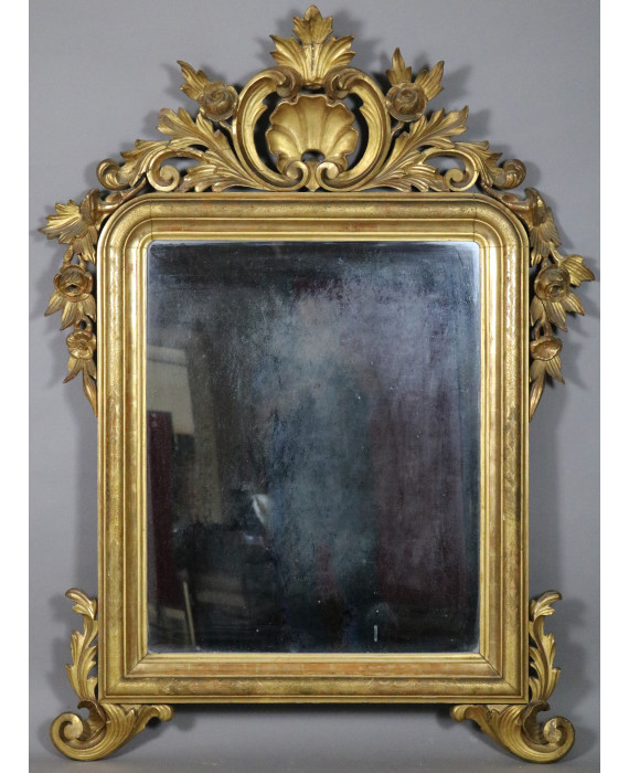 Specchiera in legno dorato, intagliato e traforato a volute vegetali, fiori e cimasa a conchiglia. Francia, sec. XIX. cm144x108 (lievi difetti e mancanze)