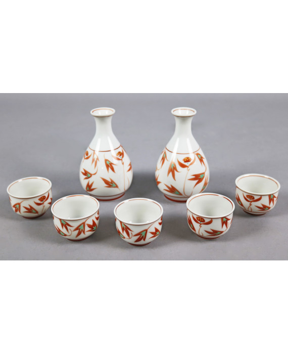 Set da sake composto da due bottigliette e cinque tazzine in porcellana dipinta, di manifattura giapponese.