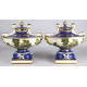Coppia di centrotavola con coperchio in porcellana a fondo blu e oro, decorata con paesaggi lacustri e personaggi, poggianti su base quadrata. cm. 34x32x26