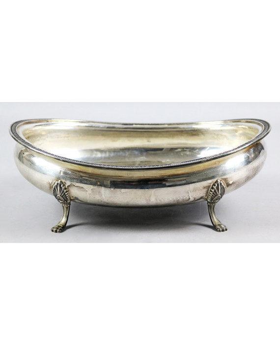 Centrotavola in argento 800 con bordo a palmette e quattro peducci a zampa. Peso gr. 920